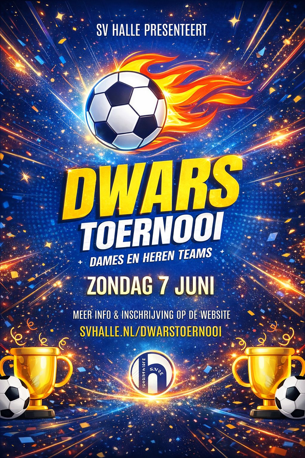 Op zondag 7 juni is het weer zover: SV Halle organiseert het jaarlijkse Dwartoersnooi voor dames- en herenteams! Een dag vol sportiviteit, gezelligheid en spannende wedstrijden. Of je nu komt om te winnen of gewoon voor de gezellige derde helft, dit toernooi wil je niet missen! 🍻🎶